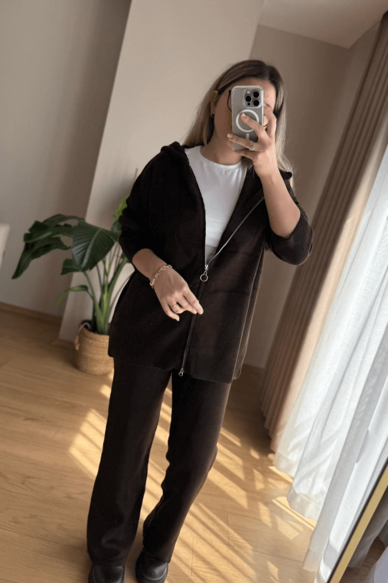 Bu acı kahve triko takım, rahatlığı ve şıklığı bir arada sunar. Esnek triko kumaşıyla hareket özgürlüğü sağlarken, oversize kesimiyle modern bir tarz sunar. Kapşonlu üstü ve rahat kesim pantolonuyla hem şık hem de rahat bir görünüm elde edersiniz. Günlük kullanım için mükemmel bir seçim!