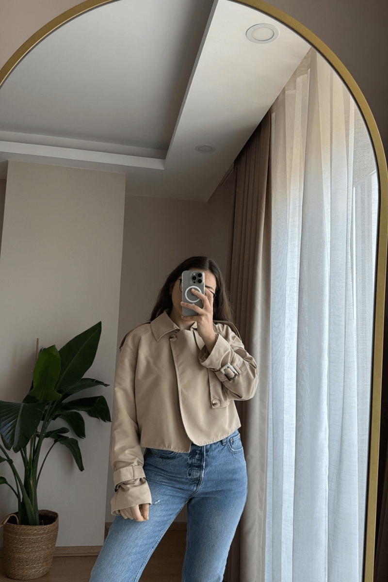 Bu bej kısa trençkot, spor ve şık bir görünüm sunar. Rahat kesimi ve harika detayları ile her mevsimde kullanılabilir. Stilinize modern bir dokunuş katmak için mükemmel bir seçimdir. Yağmurlu günlerde kendinizi şık ve korunaklı hissetmenizi sağlar.