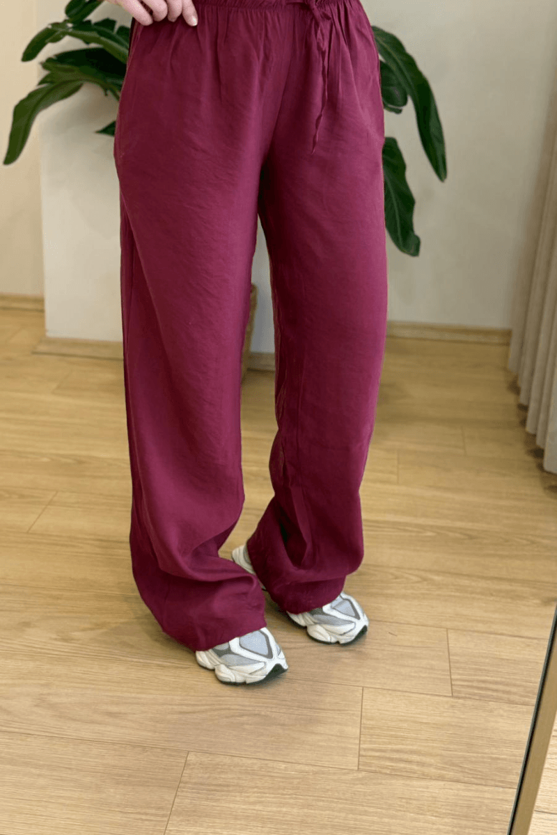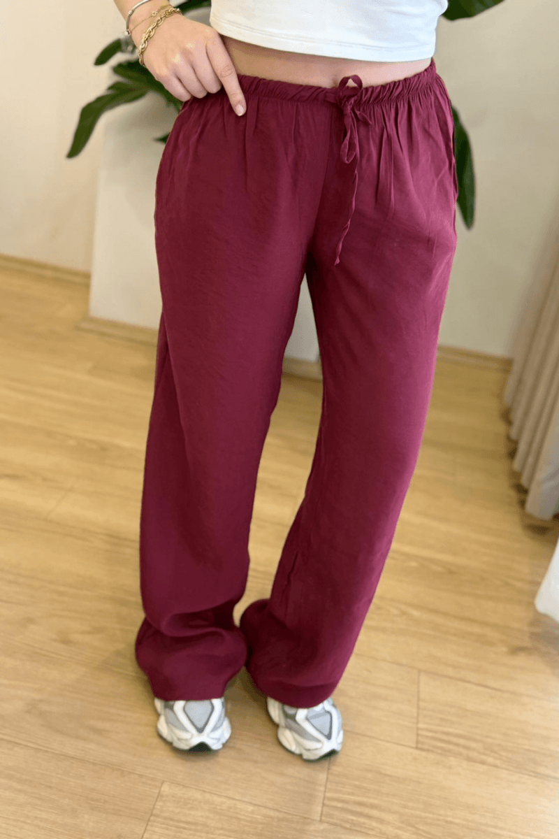 TENCEL, DÖKÜMLÜ KUMAŞ, HAFİF, HAVA ALAN VE TERLETMEZ KUMAŞ, BELİ LASTİKLİ, YÜKSEK BEL, CEPLİ, BORDO PANTOLON