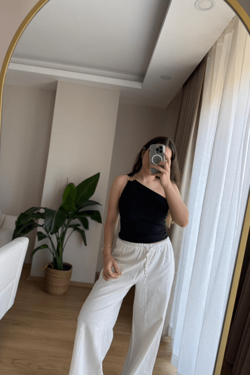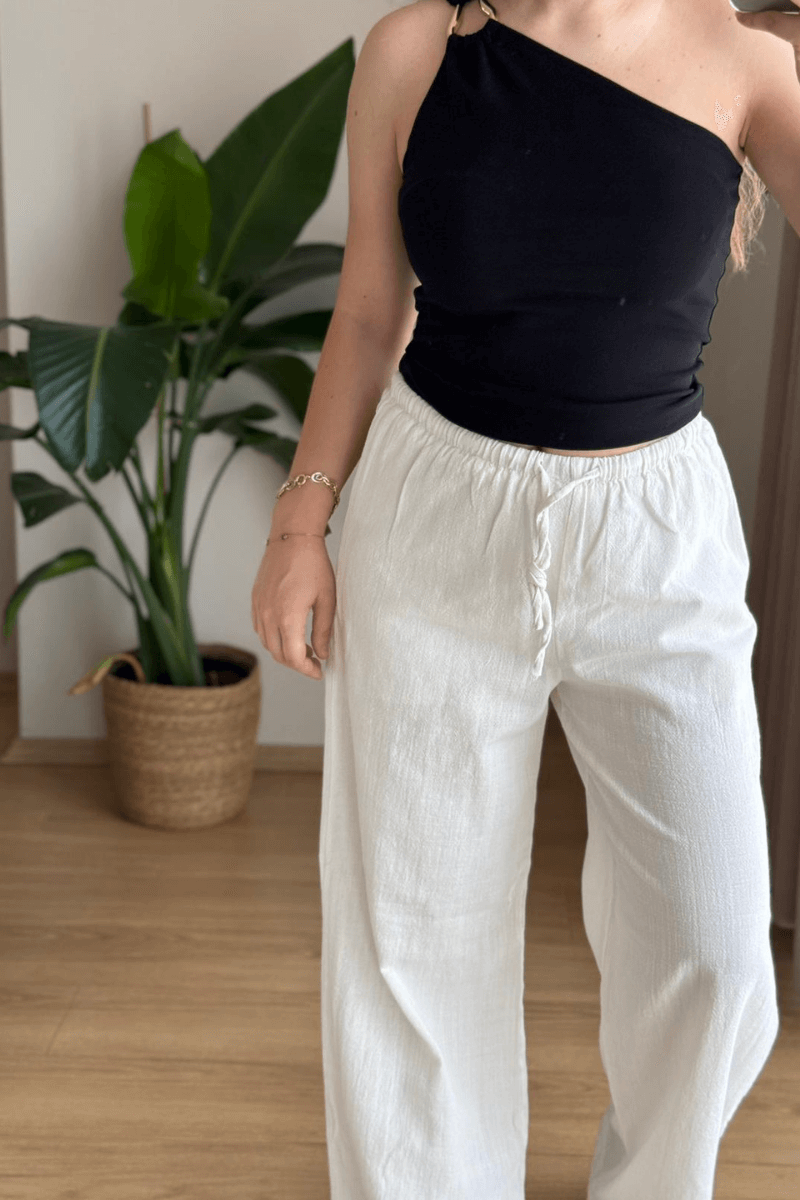 Bu ekru keten pantolon, rahat ve şık bir seçenek sunuyor. %100 pamuk dokusuyla cildinize dost bir deneyim sunarken, bol kesim ve beli lastikli yapısıyla hareket özgürlüğü sağlar. Hem günlük giyimde hem de özel günlerde şıklığınızı tamamlamak için ideal bir seçim.