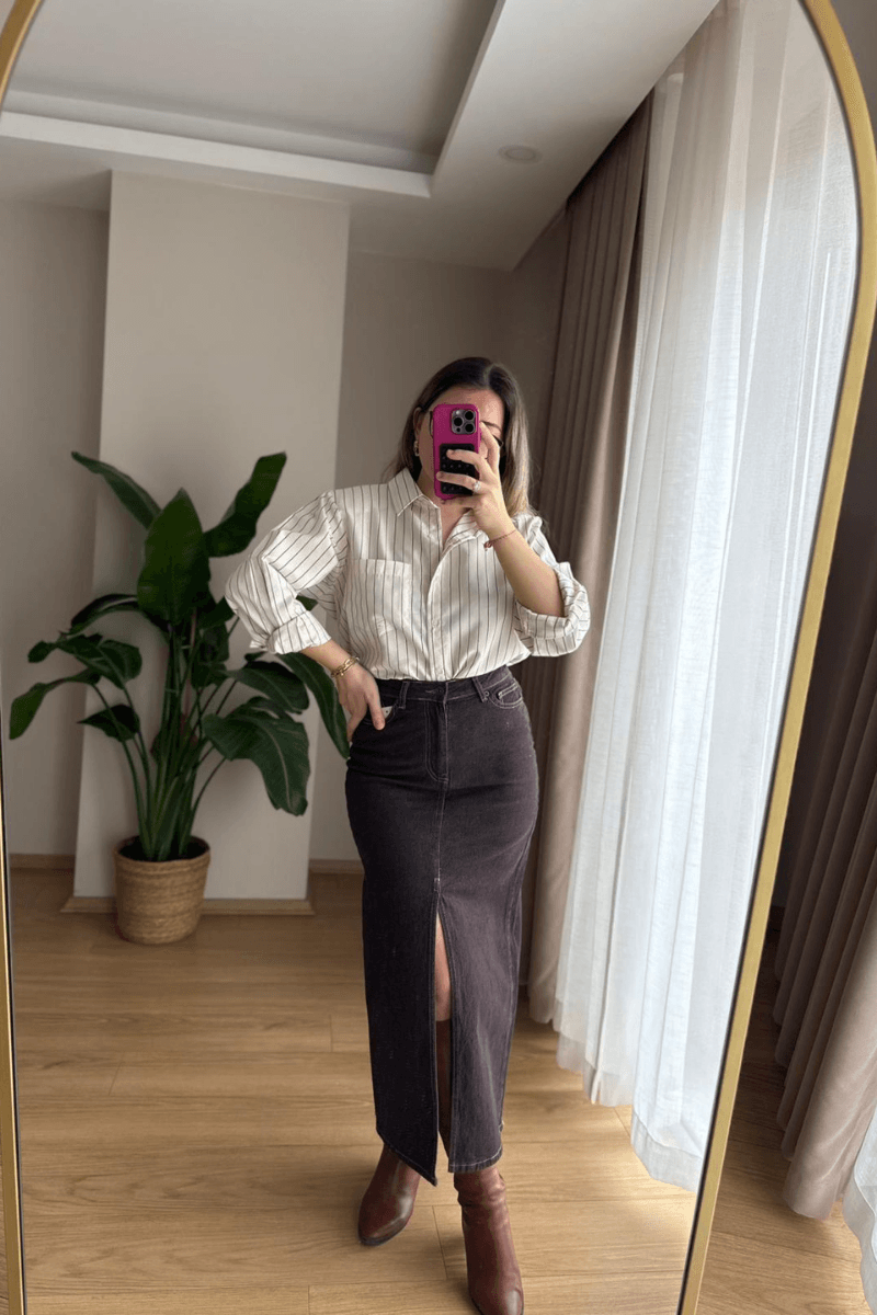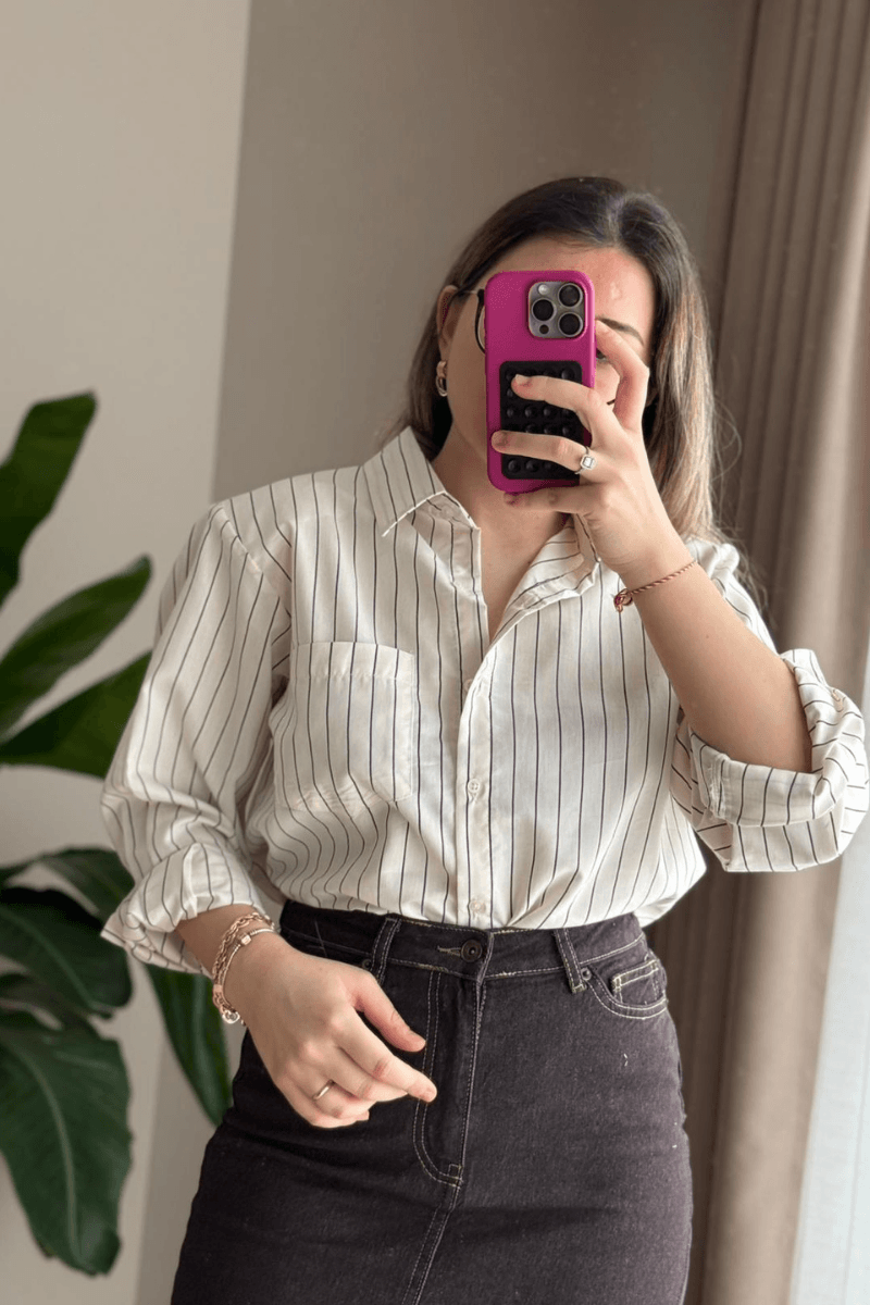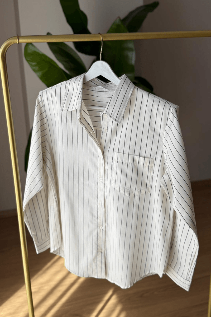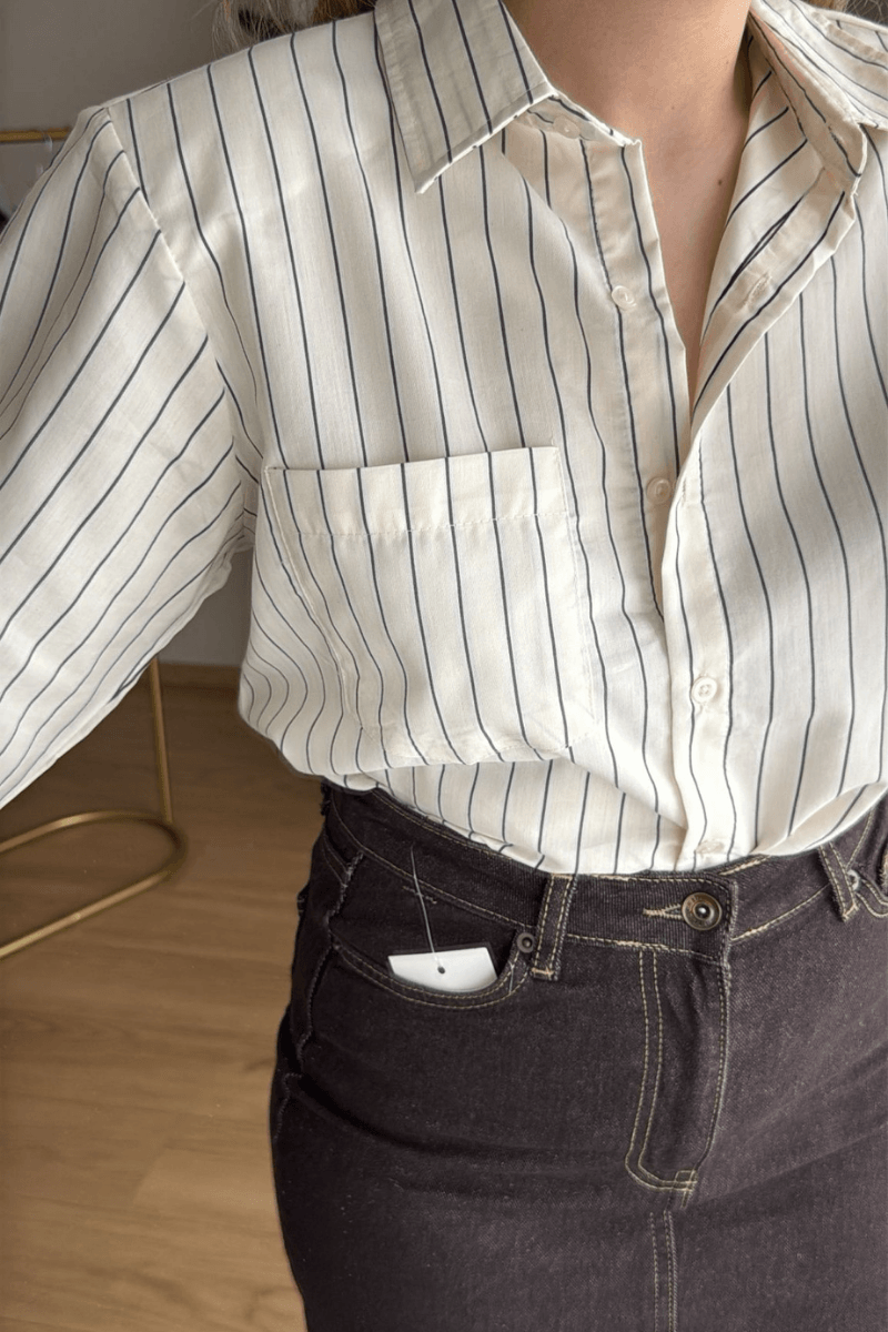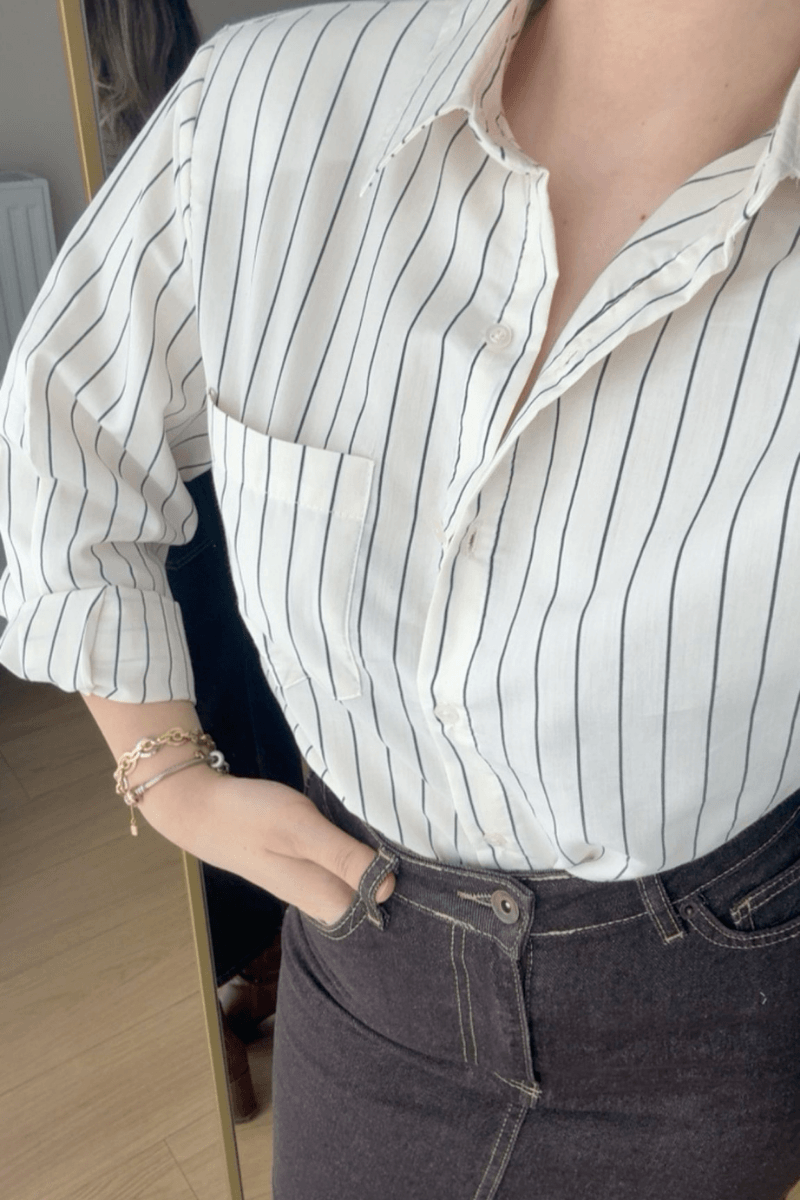 Çizgili, omuzları vatkalı ekru-siyah gömlek, şıklık ve rahatlığı bir arada sunar. Sol göğüs cebine sahip bu tasarım, modern ve klasik stilin mükemmel birleşimidir. Günlük ve özel kombinlerde öne çıkan detaylarıyla gardırobunuzun vazgeçilmezi olacak.