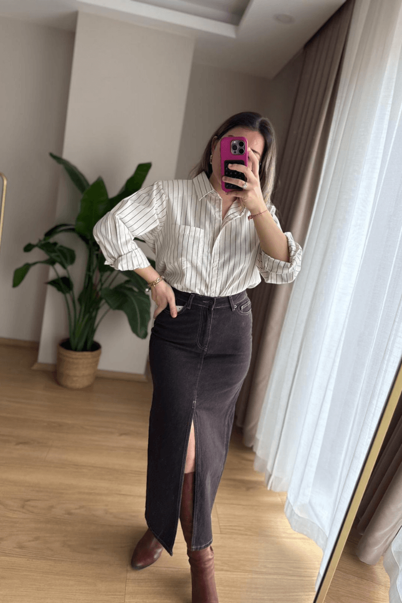 Ekru Siyah Çizgili Gömlek (Vatkalı)