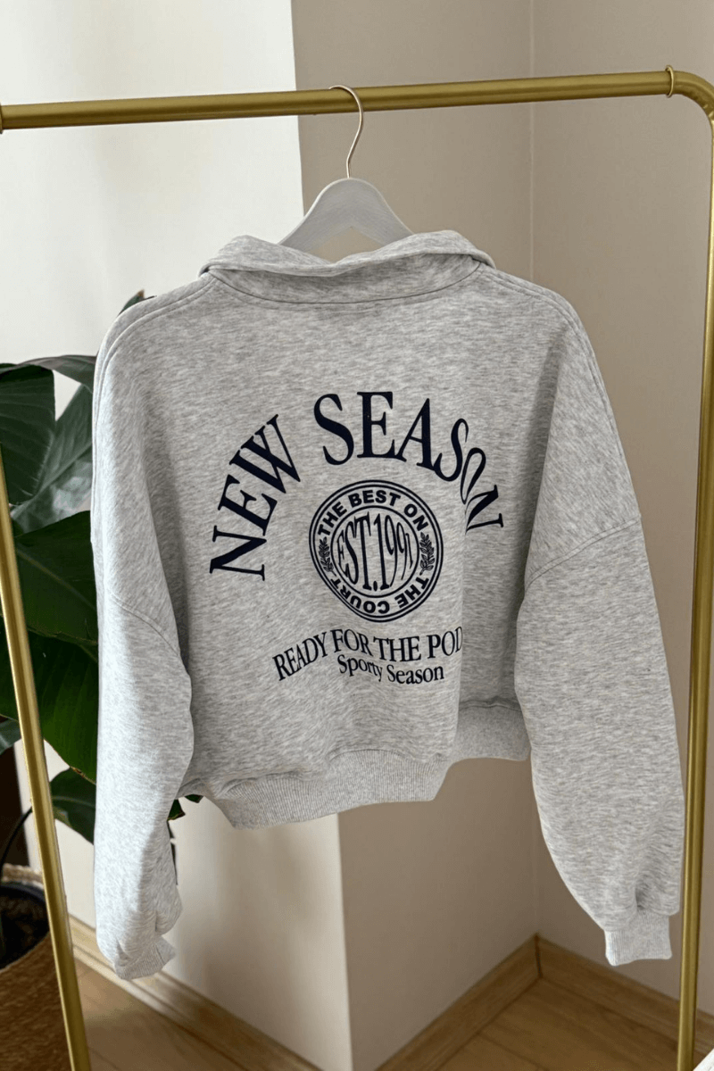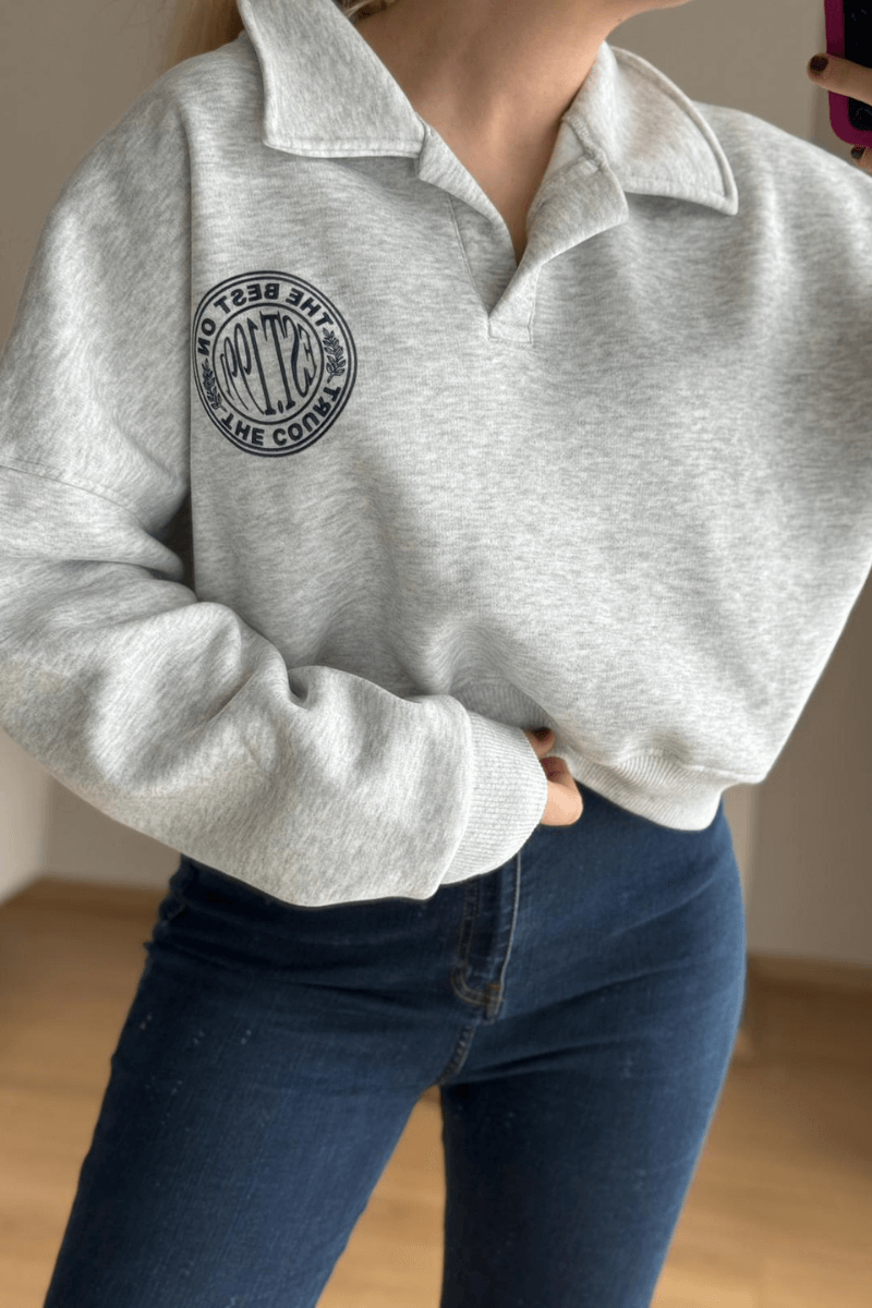 %100 PAMUK, OVERSİZE, YAKALI, V YAKA, ÖN VE ARKA BASKI DETAYLI, ETEKUCU VE KOLLARI LASTİKLİ, İÇİ ŞARDONLU, GRİ SWEATSHİRT