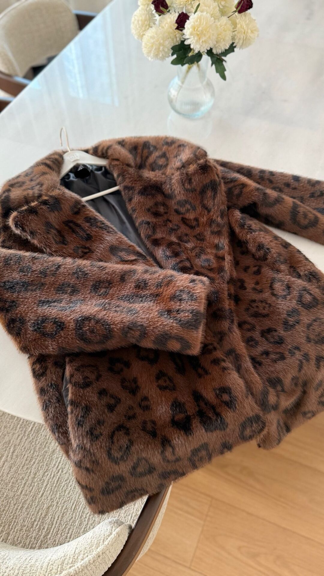 Kahverengi leopar desenli kürk, şıklığı ve sıcaklığı bir arada sunar. Rahat kesimiyle spor kombinlere zarif dokunuş katar. Hem günlük kullanıma hem özel buluşmalara uygun, dikkat çekici ve trend bir parça olarak gardırobunuzun favorisi olacak.