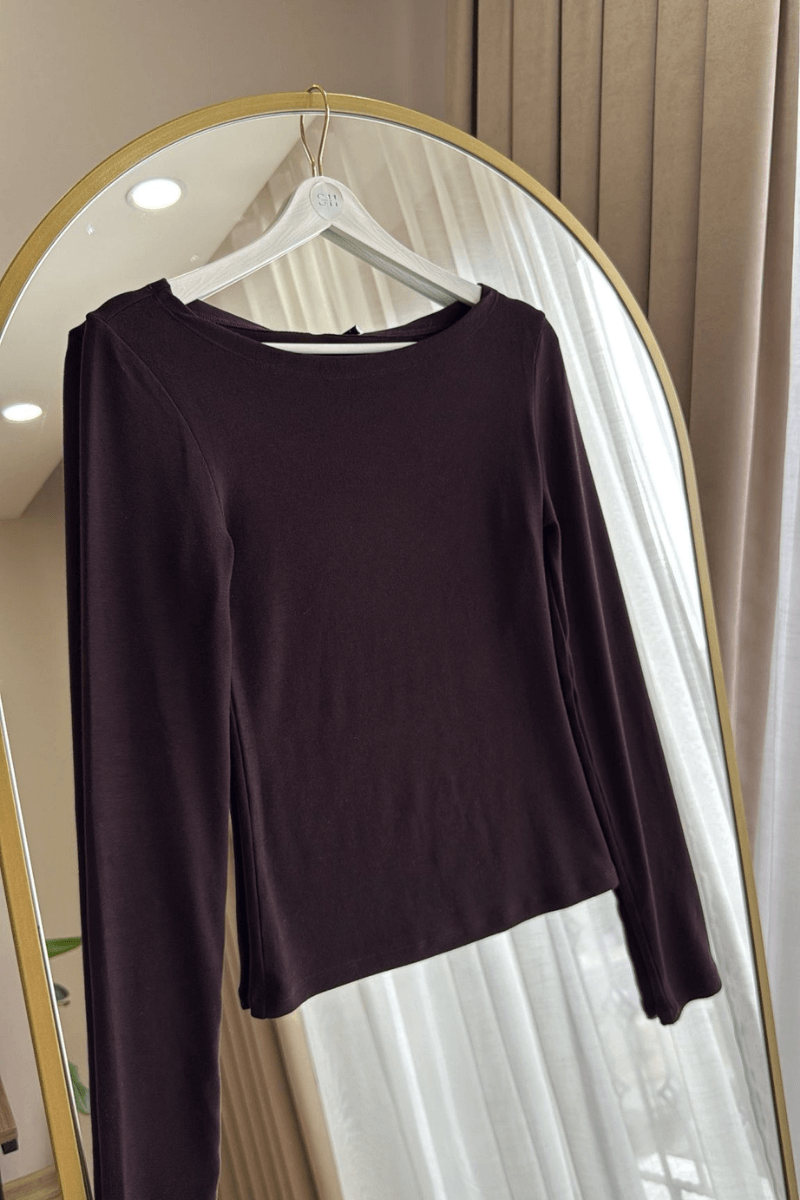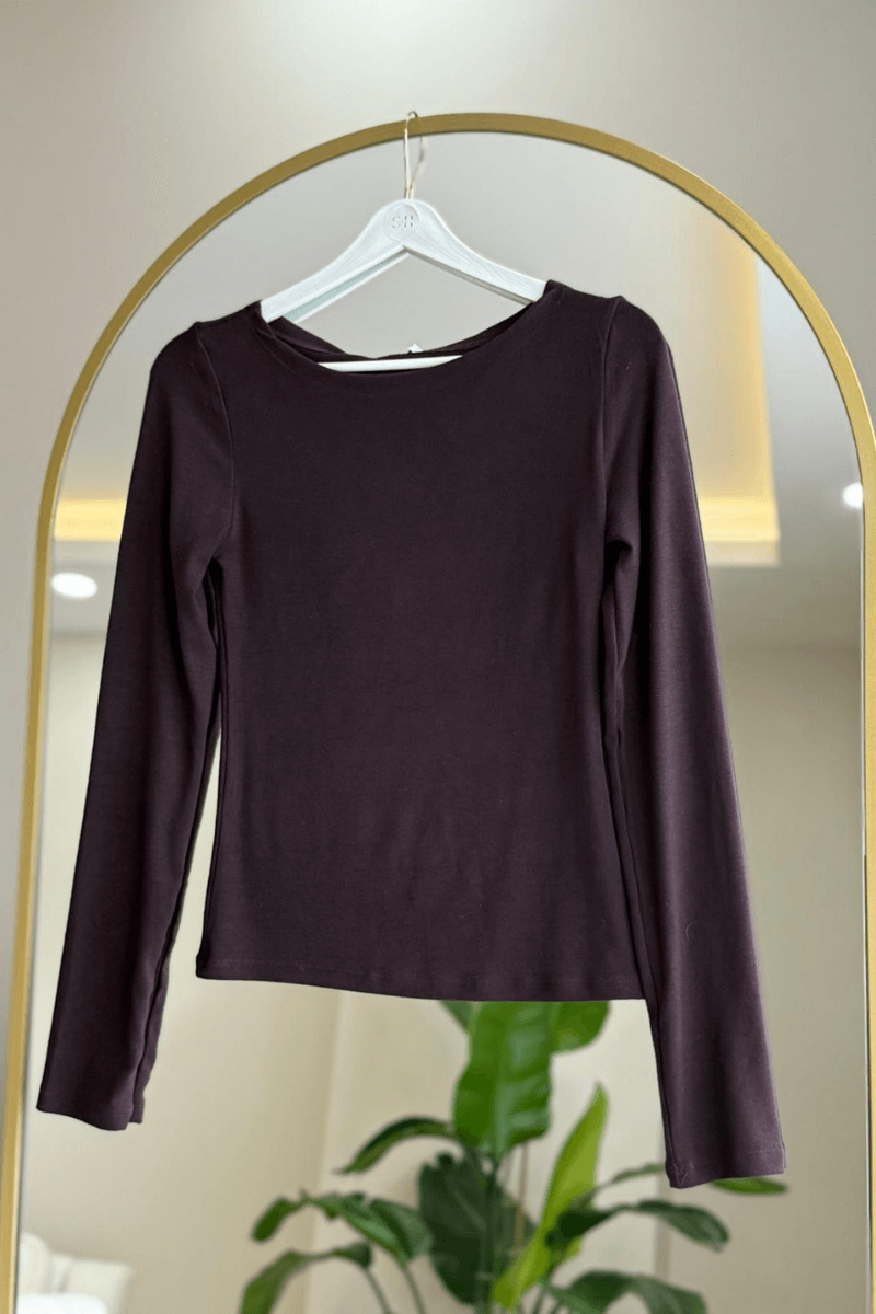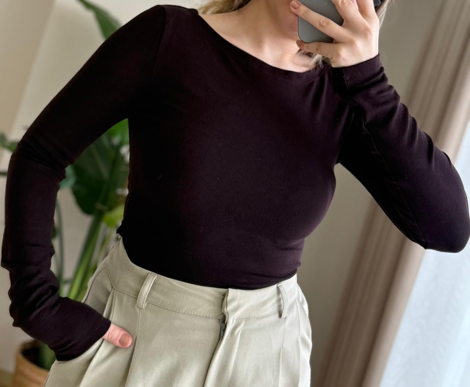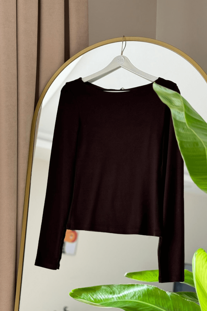 PAMUKLU, LİKRALI, YUMUŞAK DOKU, KAYIK YAKA, KAHVERENGİ BLUZ