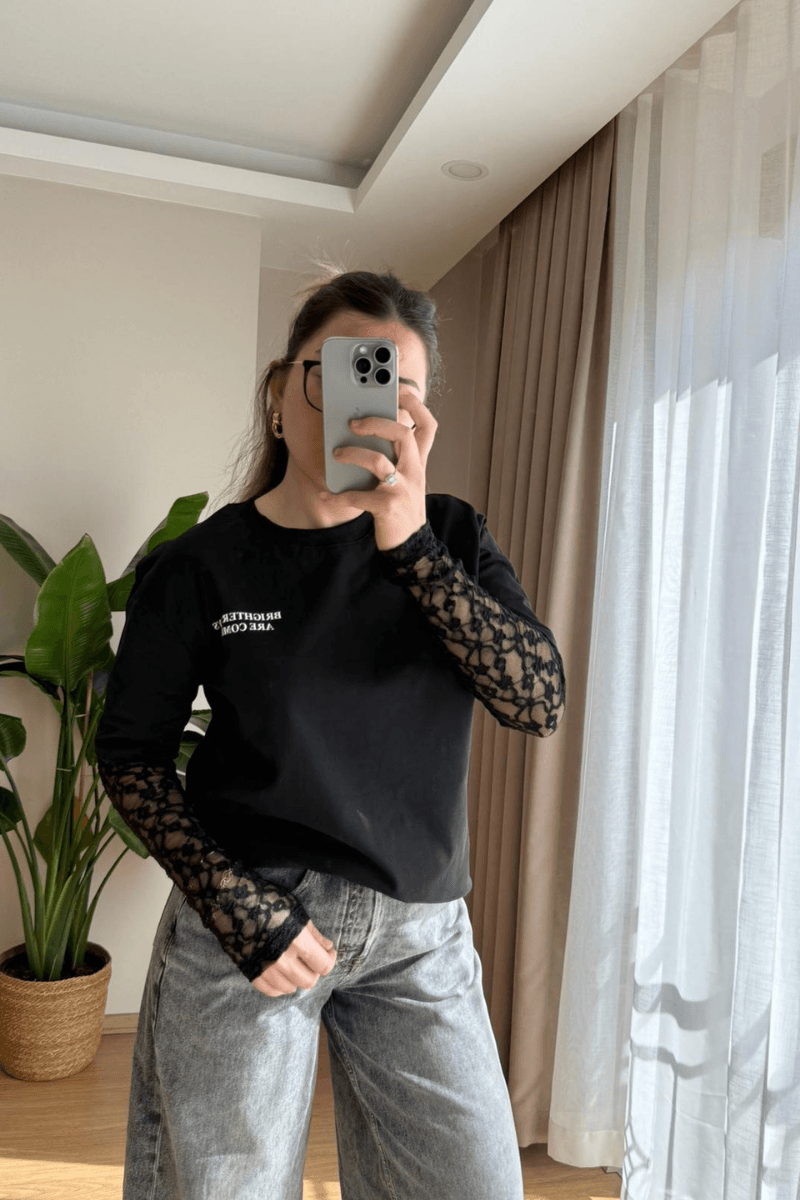 Siyah tişörtün kollardaki siyah dantel detaylarıyla sofistike bir görünüm sunar. %95 pamuk içeriği sayesinde yumuşacık ve rahat kullanım sağlar. Spor-şık tasarımı, hem günlük hayatta hem özel anlarda tarzınızı tamamlar. Kendinizi özel hissettirecek şıklık burada buluşuyor!