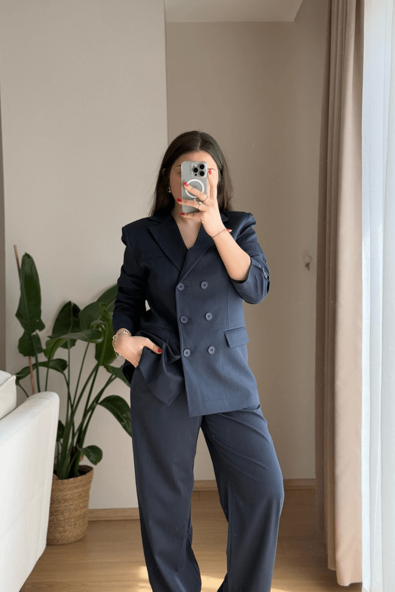 Lacivert İnce Çizgili Blazer-Pantolon Takım