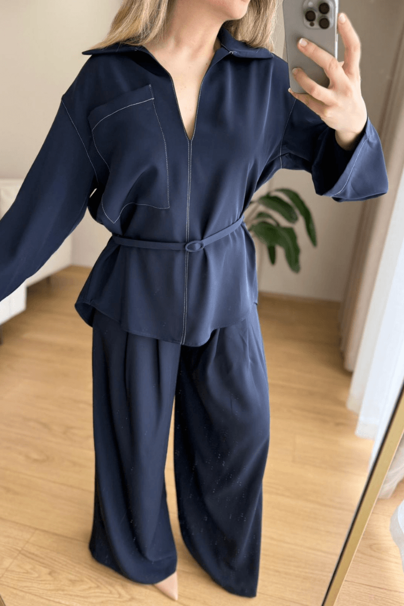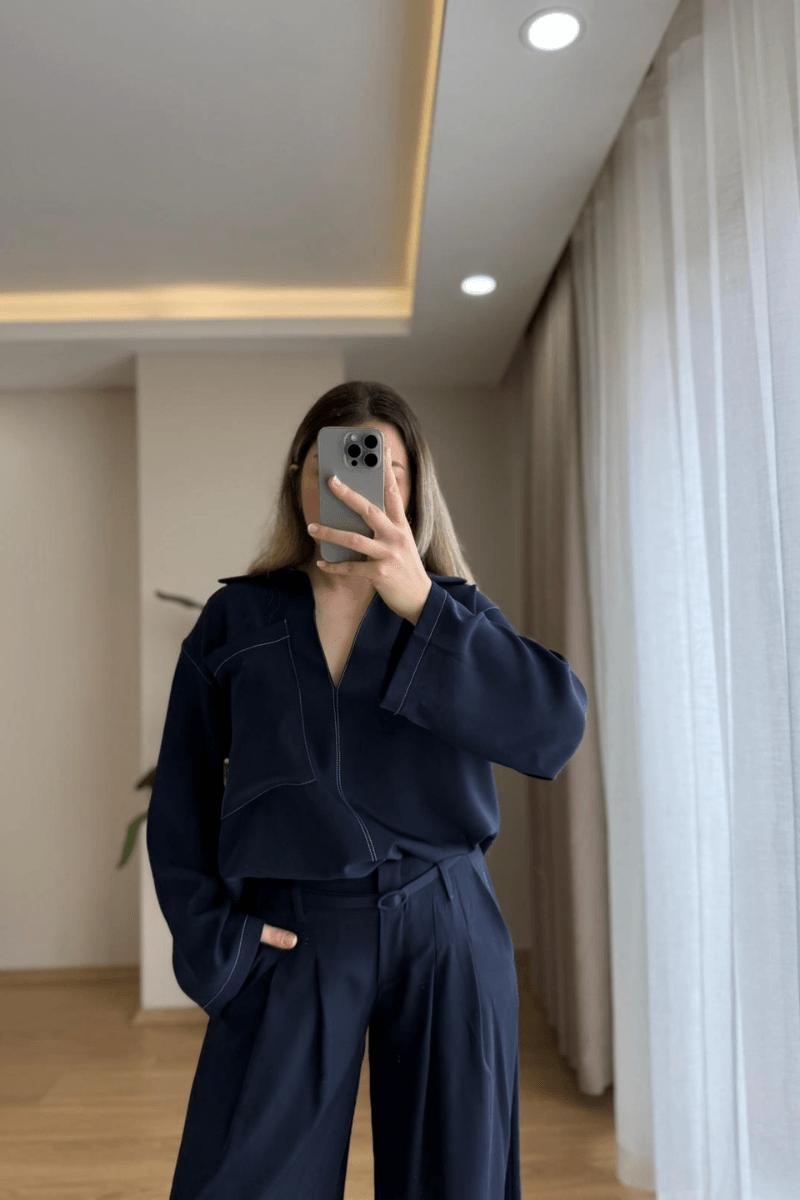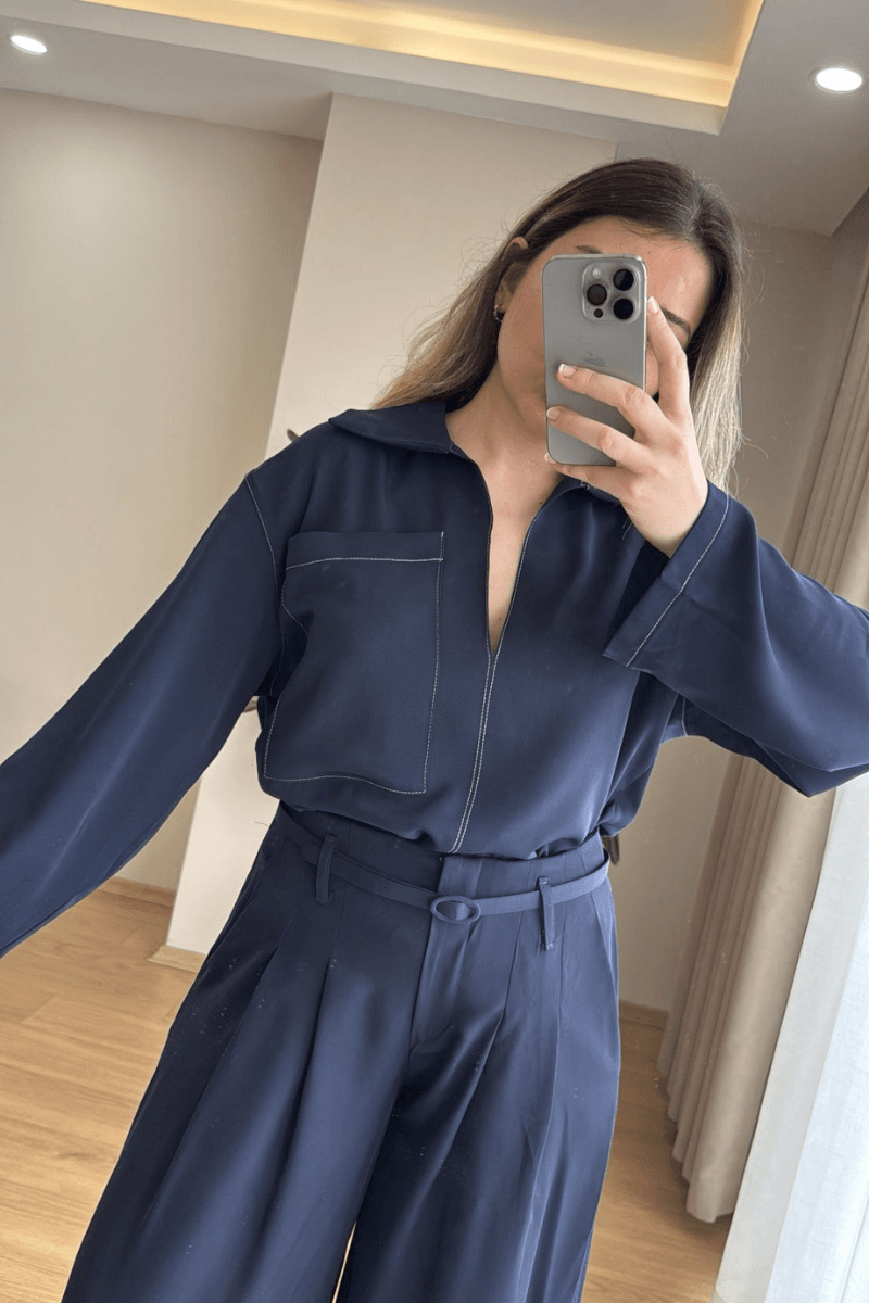 V YAKA, SOL ÖN CEPLİ BLUZ, BOL KESİM, DİKİŞ DETAYLI, KEMERLİ, PANTOLON FERMUARLI, CEPLİ, BOL KESİM, GENİŞ KALIP LACİVERT TAKIM, TİRİL TİRİL, LİKRALI, YUMUŞAK DOKU, NEFES ALAN KUMAŞ, UZUN ÖMÜRLÜ KALİTE