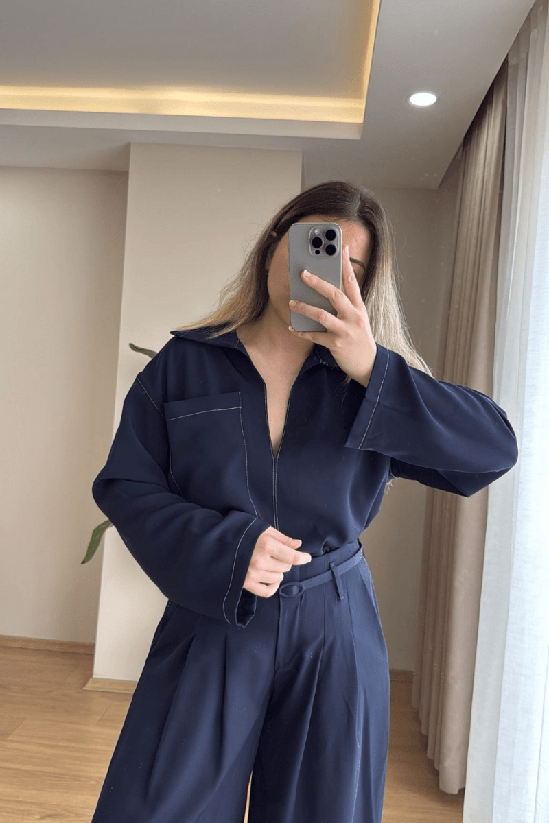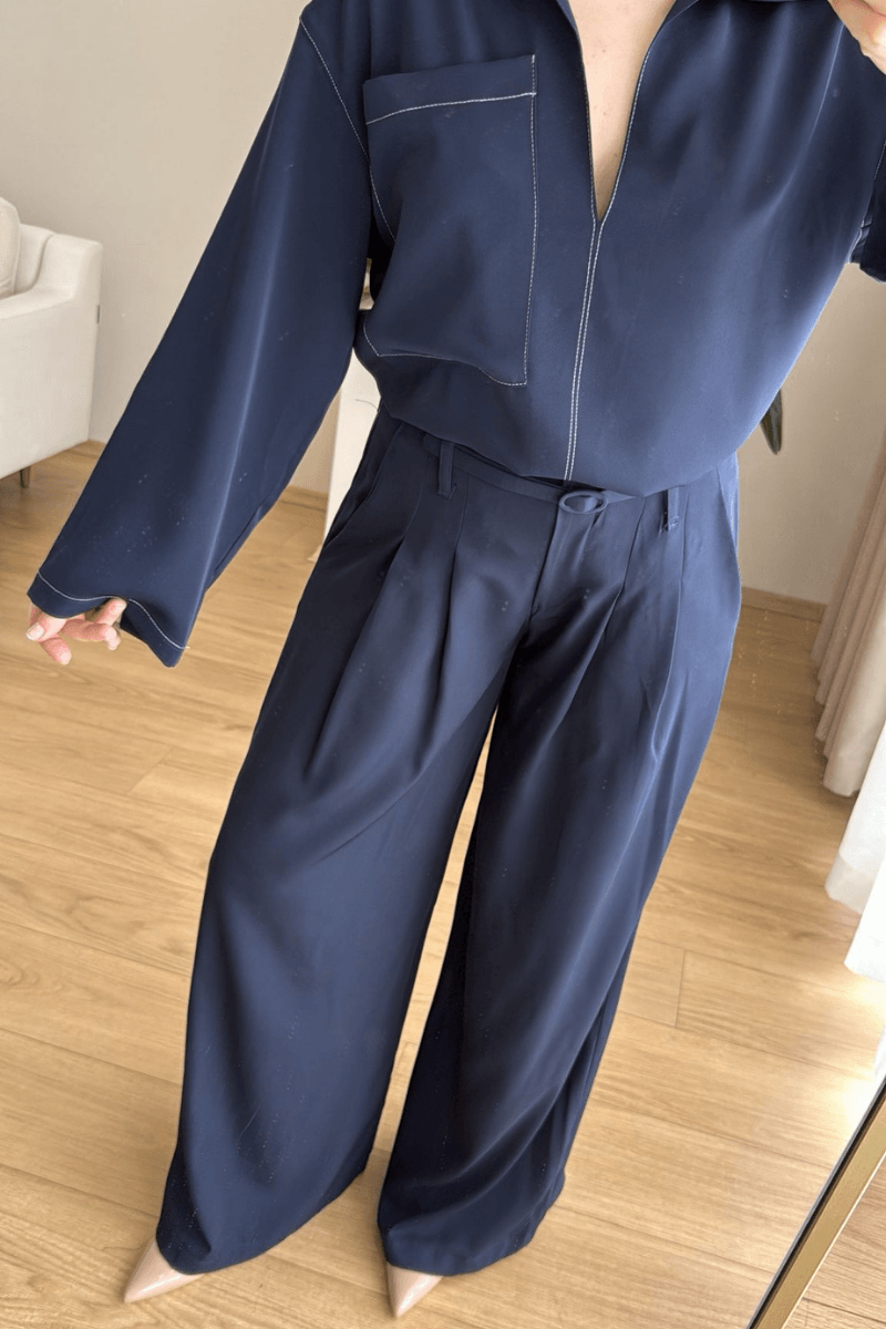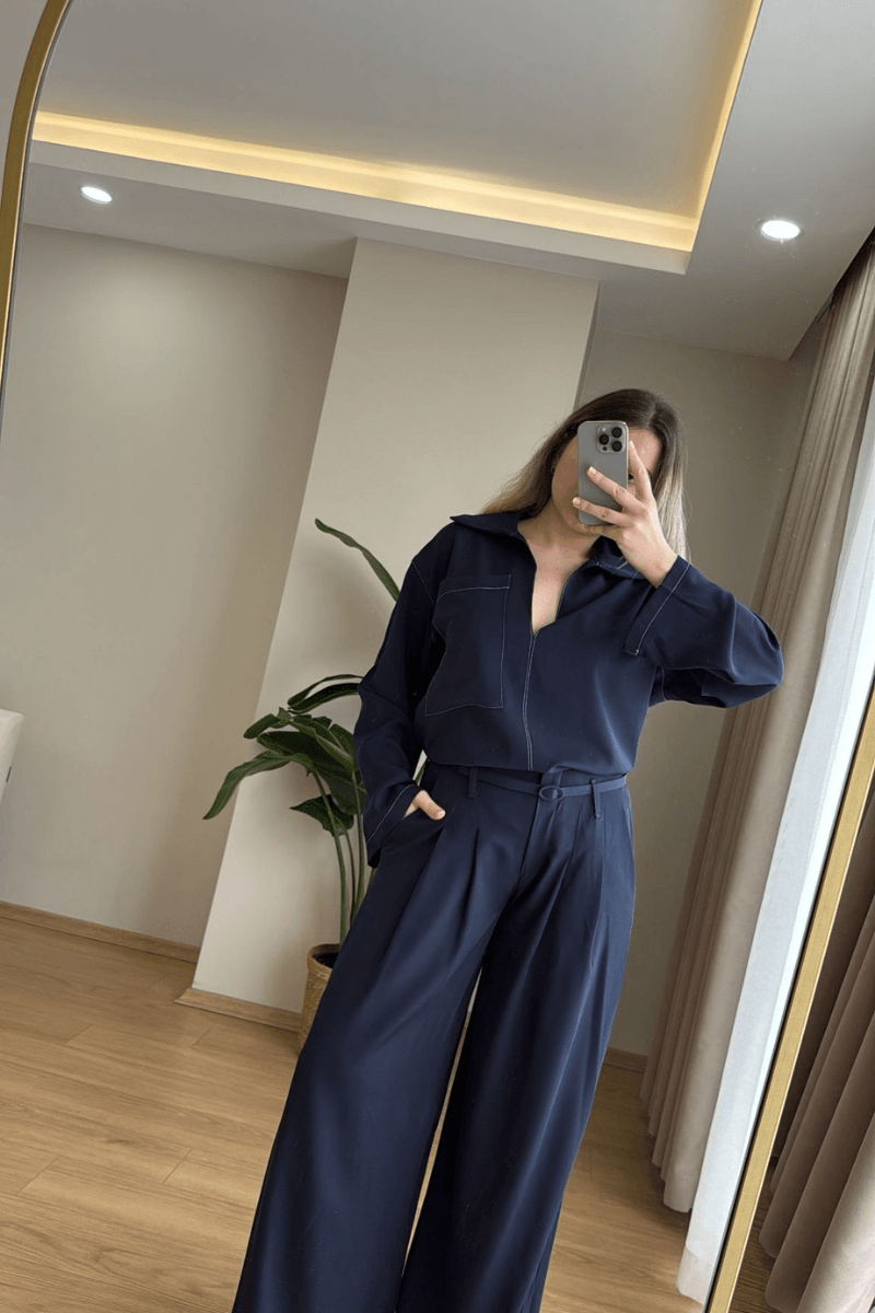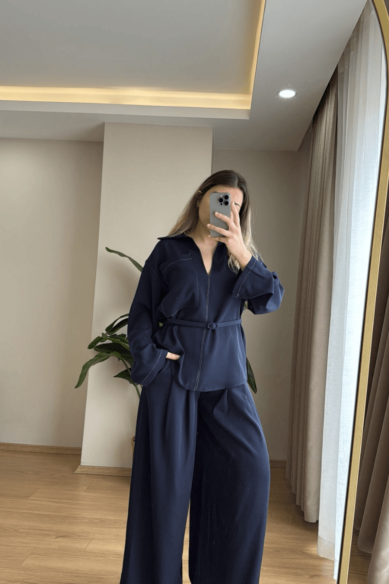 V YAKA, SOL ÖN CEPLİ BLUZ, BOL KESİM, DİKİŞ DETAYLI, KEMERLİ, PANTOLON FERMUARLI, CEPLİ, BOL KESİM, GENİŞ KALIP LACİVERT TAKIM, TİRİL TİRİL, LİKRALI, YUMUŞAK DOKU, NEFES ALAN KUMAŞ, UZUN ÖMÜRLÜ KALİTE