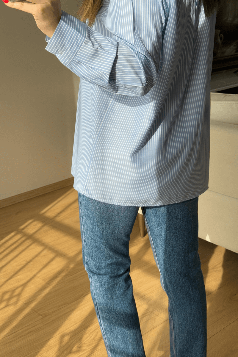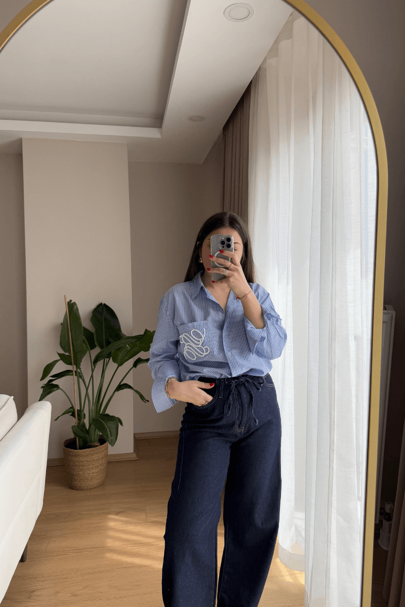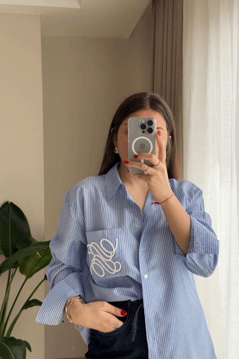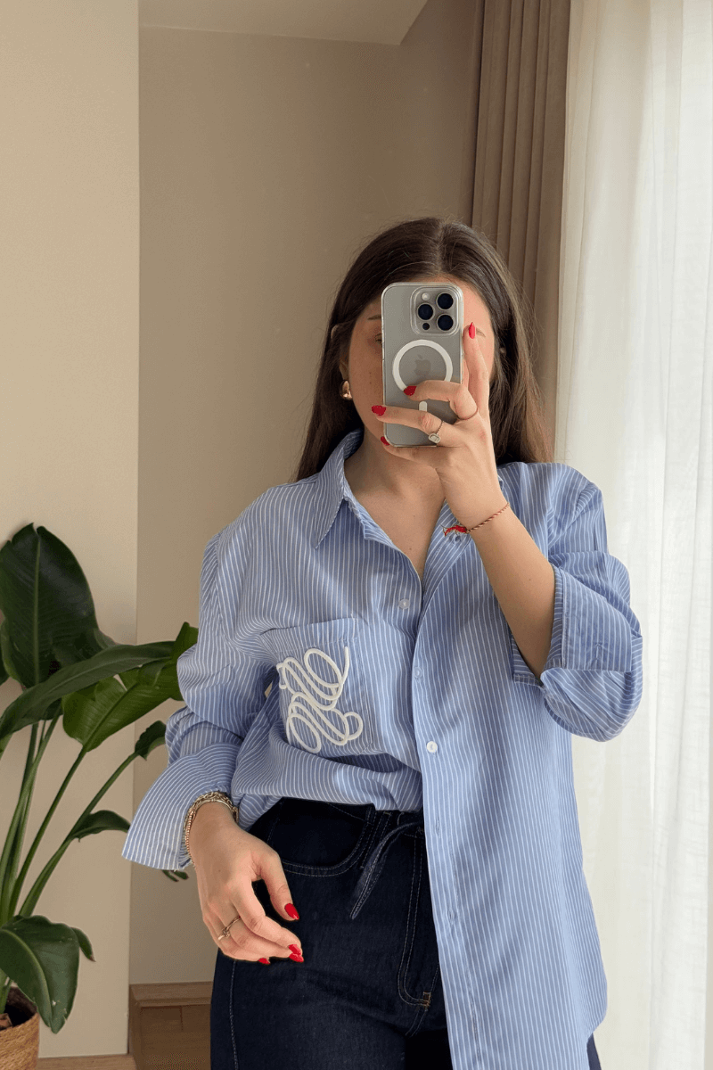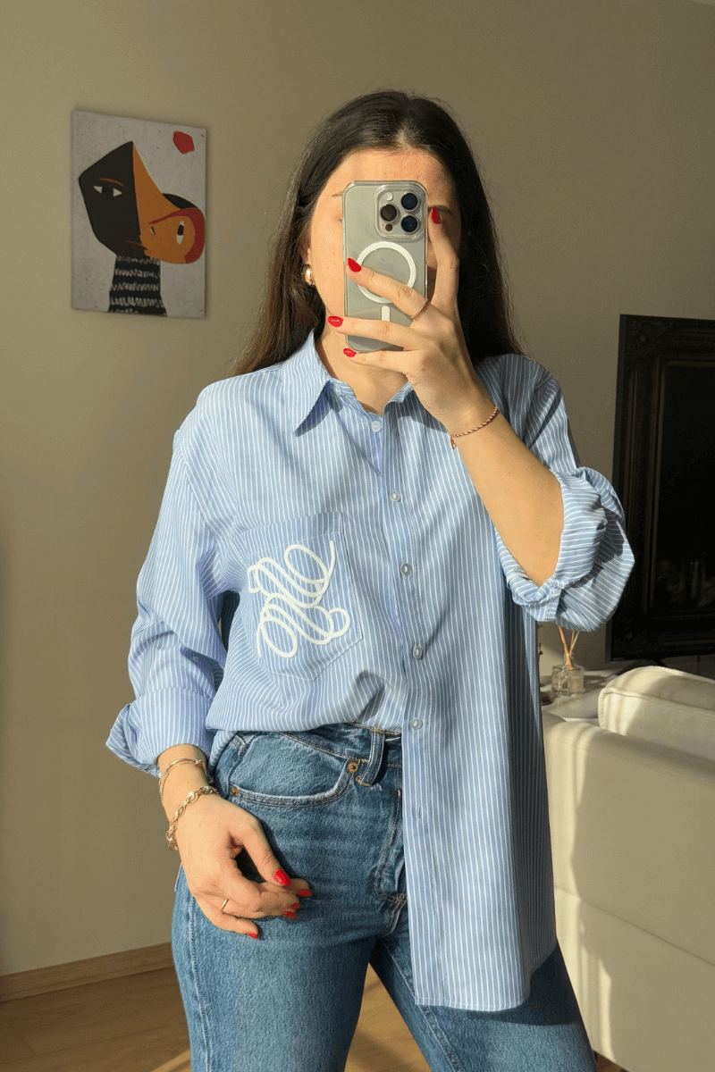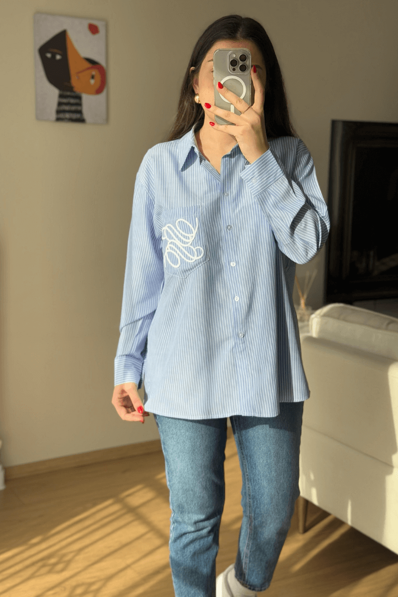 Mavi Çizgili Cep İşlemeli Gömlek