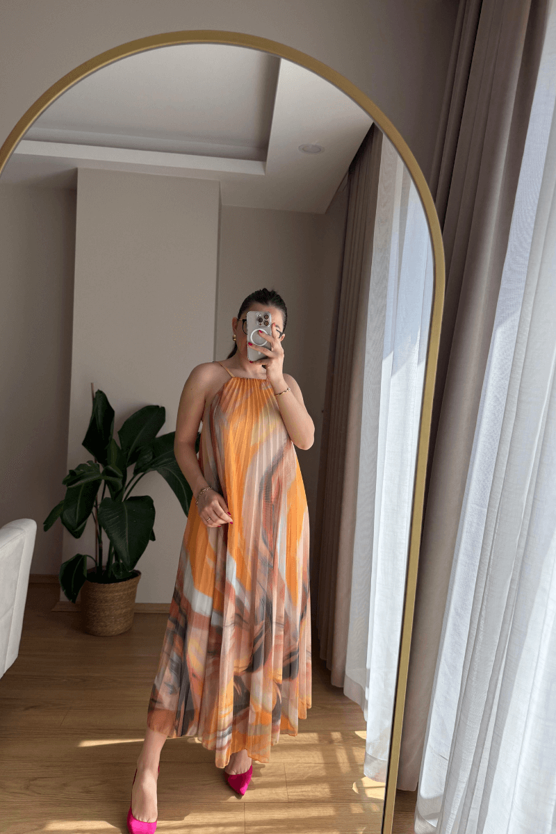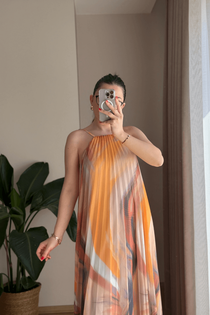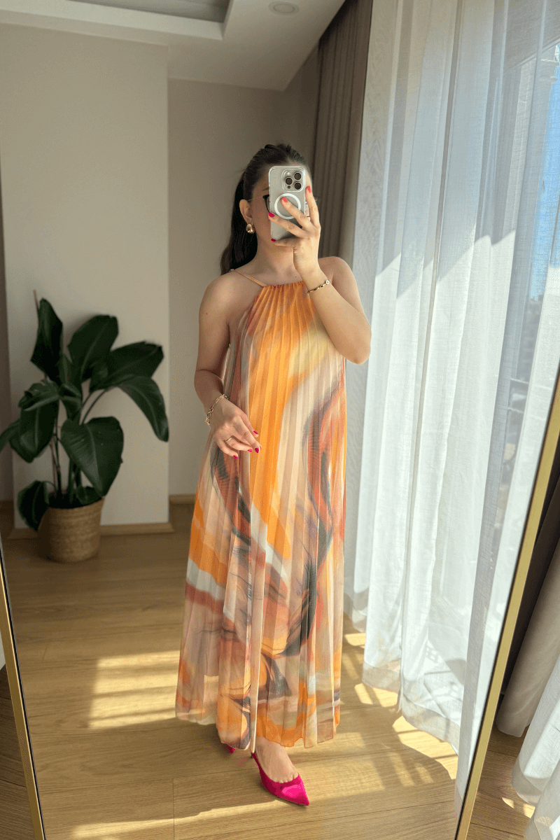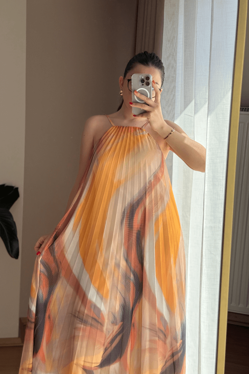SIRTI LASTİKLİ, İÇİ ASTARLI, SARI-TURUNCU RENK GEÇİŞLİ, PİLİSELİ ELBİSE