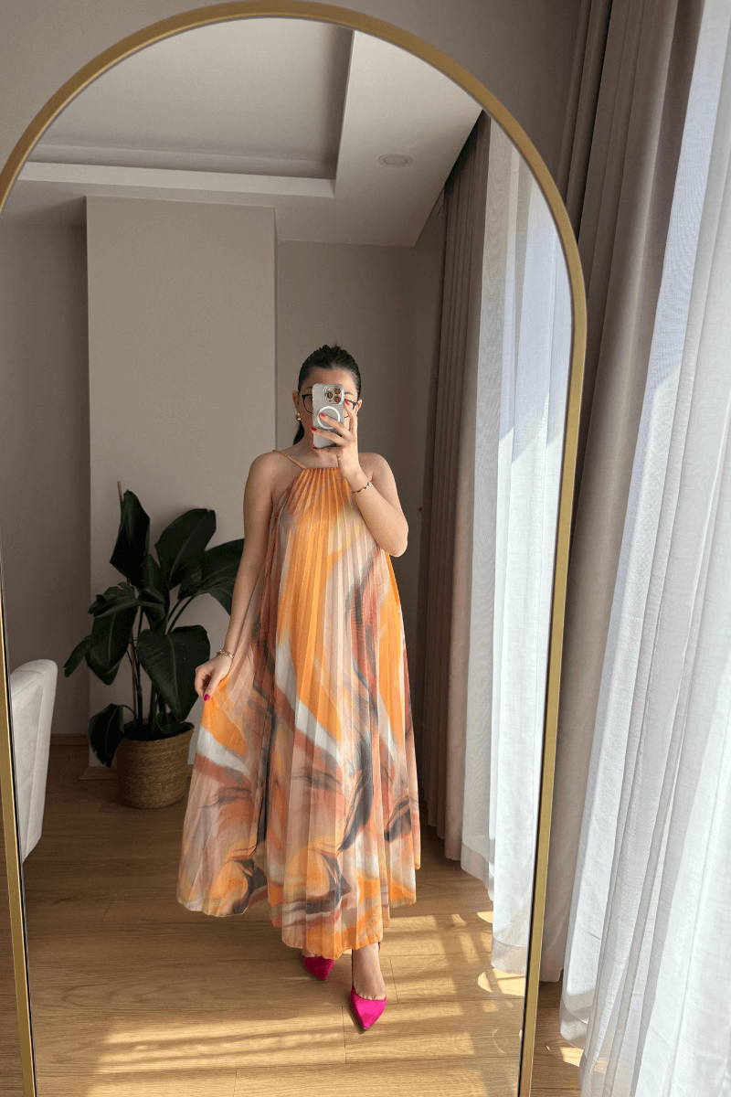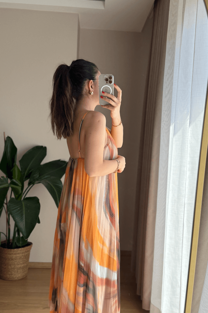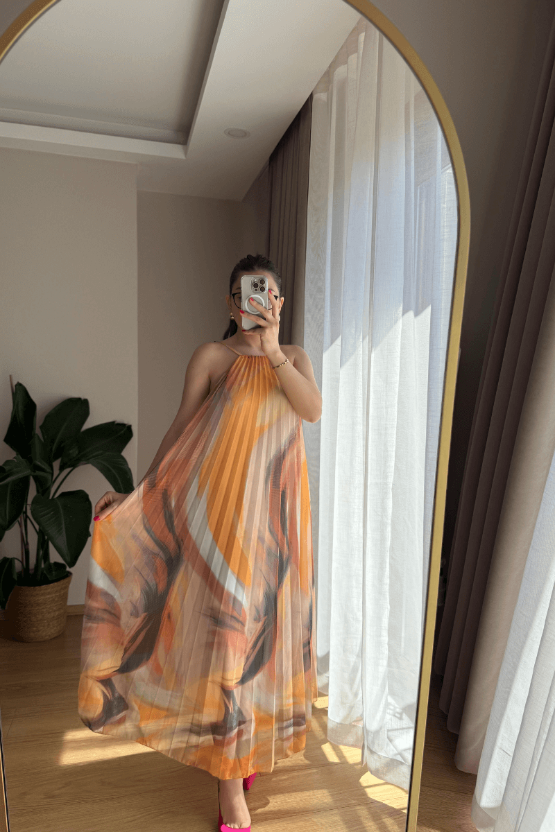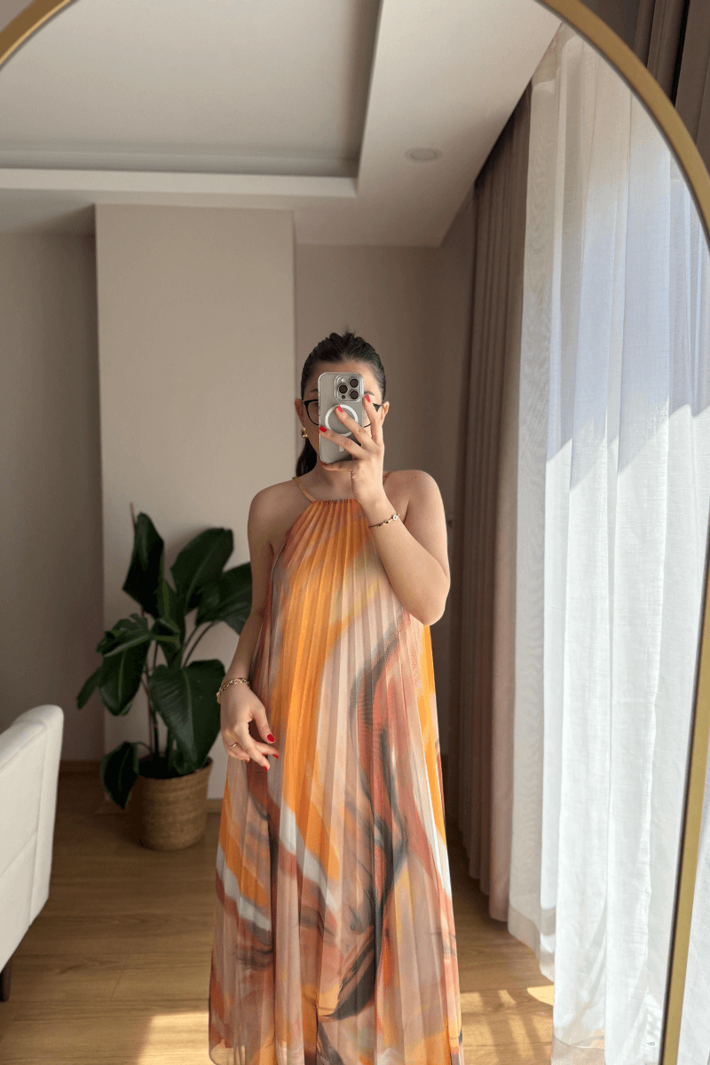 SIRTI LASTİKLİ, İÇİ ASTARLI, SARI-TURUNCU RENK GEÇİŞLİ, PİLİSELİ ELBİSE