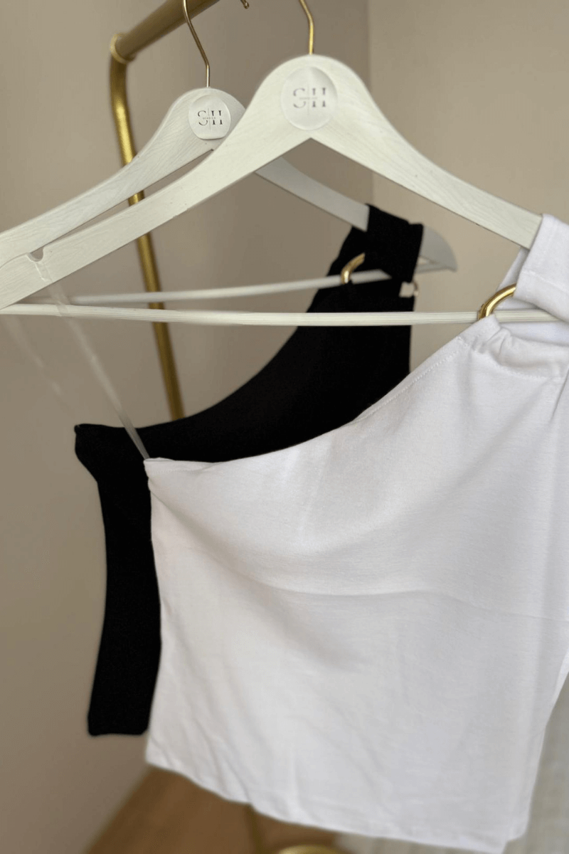 GOLD DETAYLI, LİKRALI, TEK OMUZLU, SİYAH BLUZ, SPOR ŞIK