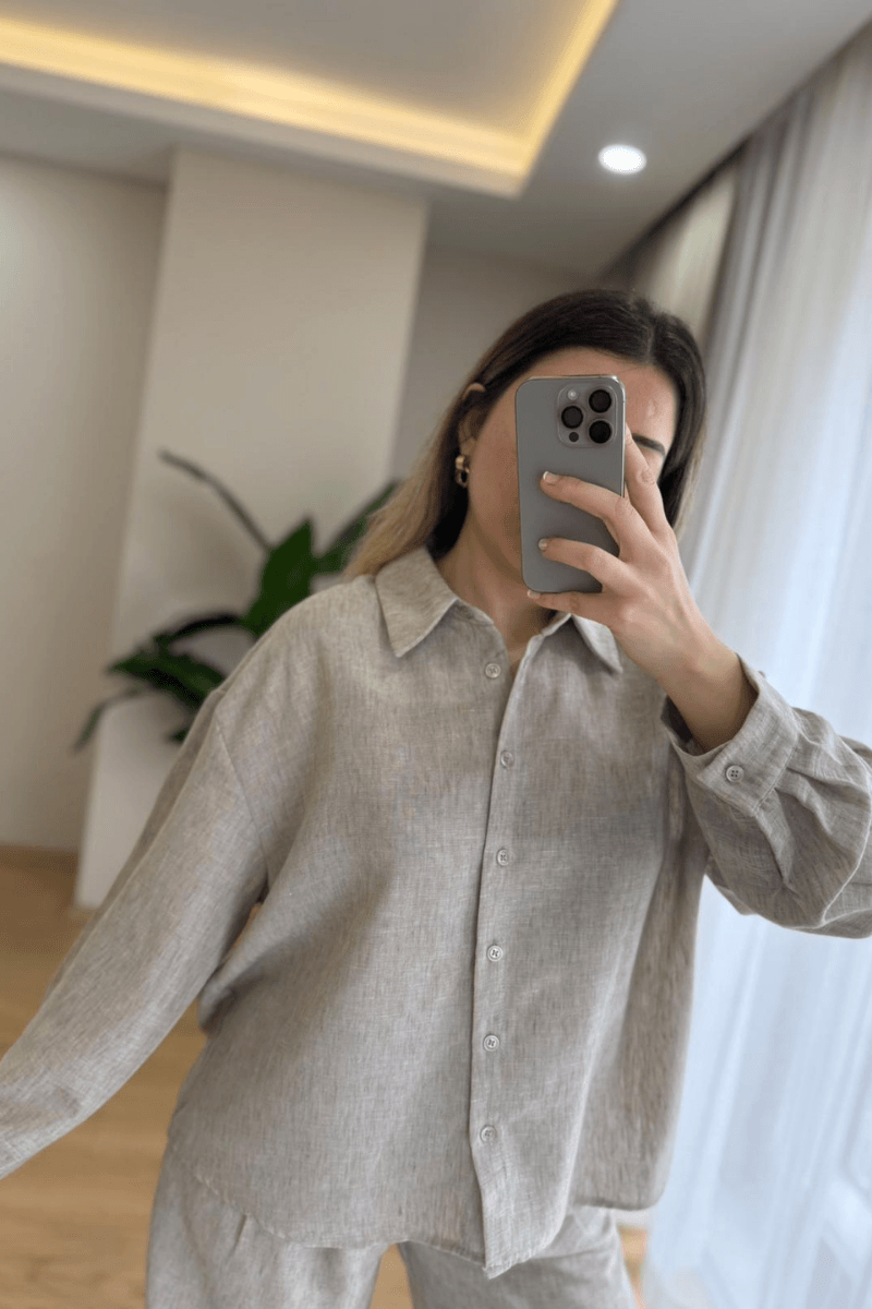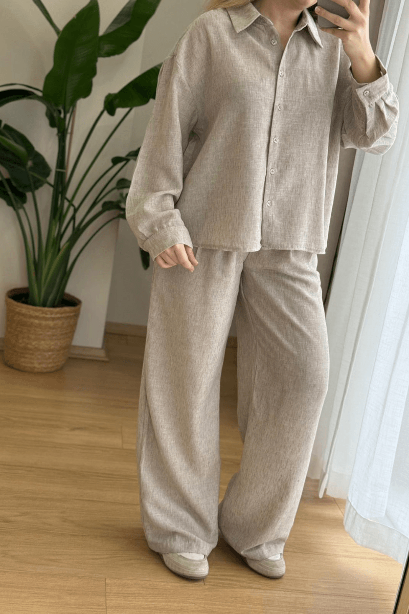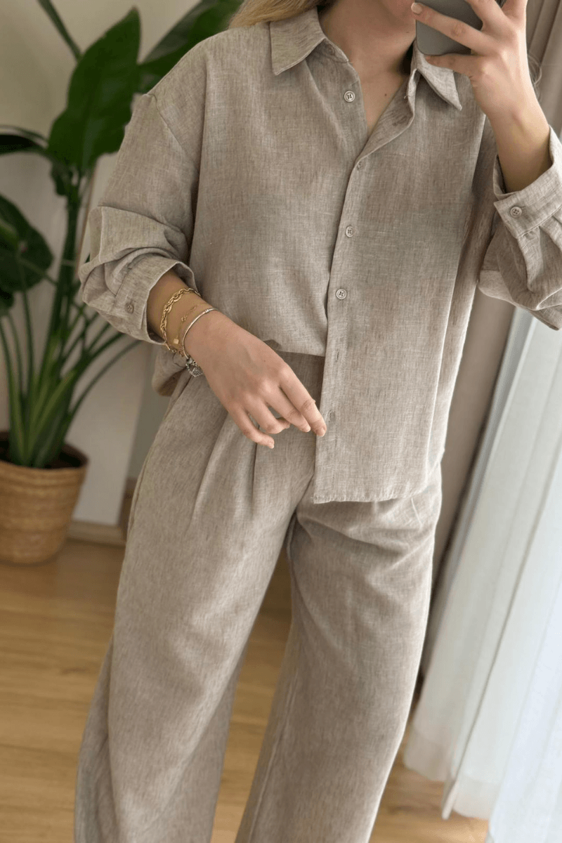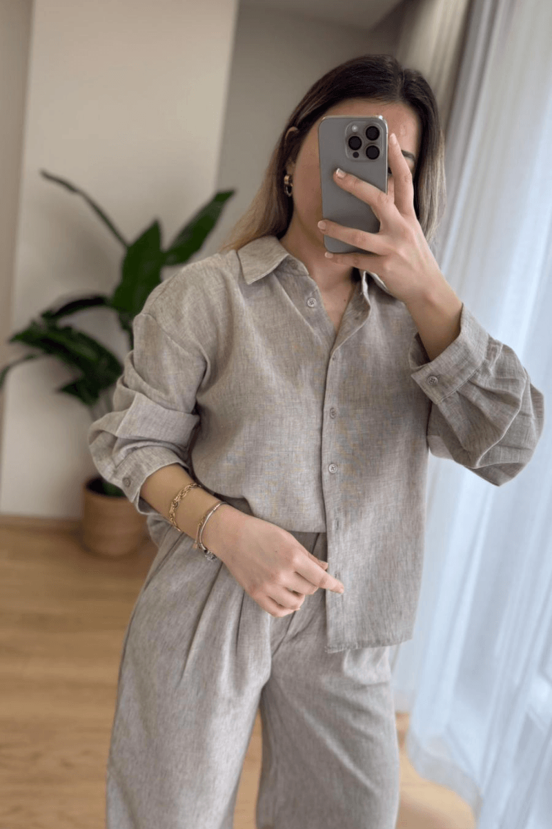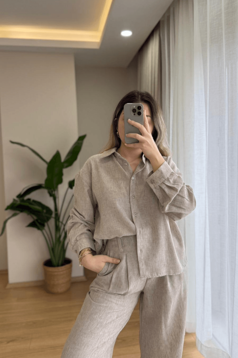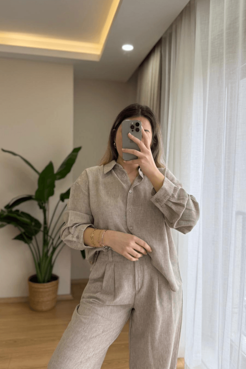 Taş rengi keten gömlek takımı, rahatlığı ve şıklığı bir araya getiren ideal bir seçenektir. Keten kumaşın doğal yapısı sayesinde ciltte kaşındırma yapmaz ve nefes alabilirlik sağlar. Üstü bol kesim gömlek ve oversize tasarımı, hareket özgürlüğü sunarken stilinizi tamamlar. Takımın taş rengi, hem günlük kullanımda hem de özel davetlerde kombin kolaylığı sağlar. Bol kesim cepli pantolon ile uyumlu olan bu keten gömlek takımı, rahat ve şık görünmek isteyenler için mükemmeldir. Bu tasarım, konforu ve estetiği ön planda tutar.