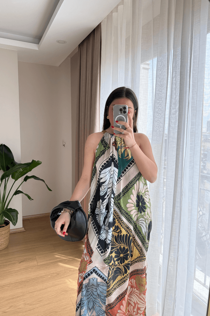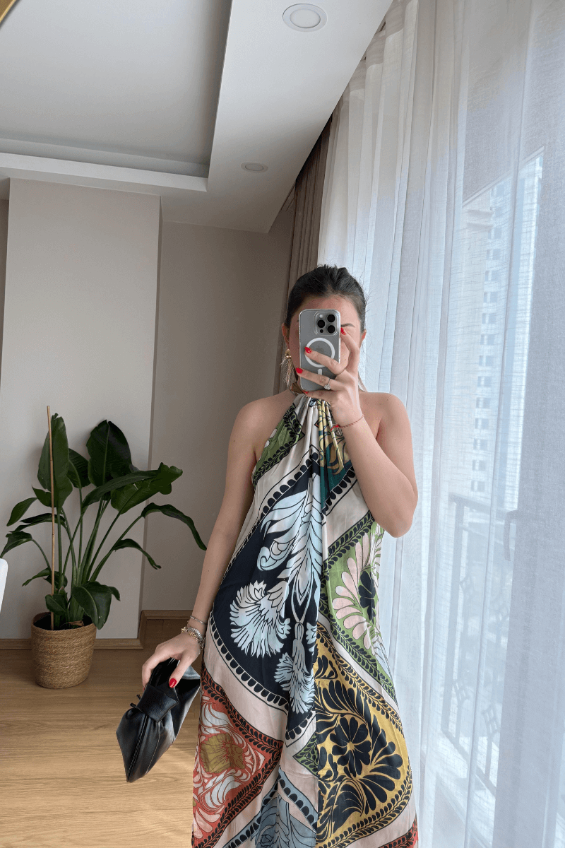 Desenli Saten Yırtmaçlı Boyundan Bağlamalı Elbise